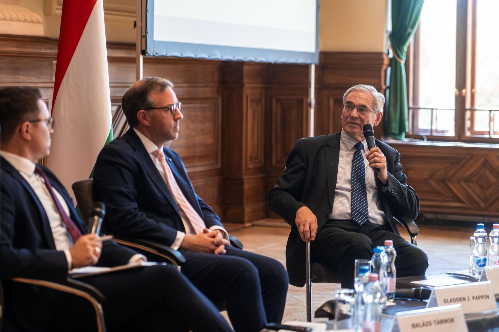 The closing session, “The Future of American–Hungarian Relations,” moderated by Balázs Tárnok, featured Gladden J. Pappin, President of the Hungarian Institute of International Affairs, and Amb. Tamás Magyarics, Professor Emeritus at Eötvös Loránd University. President Pappin noted that while U.S.–Hungarian relations remain strong, the international order is undergoing profound transformation. The liberal world order is weakening, and the United States increasingly defines its foreign policy based on national interests, focusing inward on domestic renewal. Hungary, he argued, can identify with this sovereign, self-reliant approach to security and statecraft. Professor Magyarics added that although Hungary is no longer the United States’ primary regional partner — a role now more associated with Poland and Romania — military cooperation remains excellent, and Hungary has significantly increased its defense spending. Despite differing perceptions of the war in Ukraine, both countries share the strategic goal of achieving peace as soon as possible. Future U.S. domestic political developments, he suggested, may shape the direction of bilateral relations, but the current positive atmosphere is likely to persist.