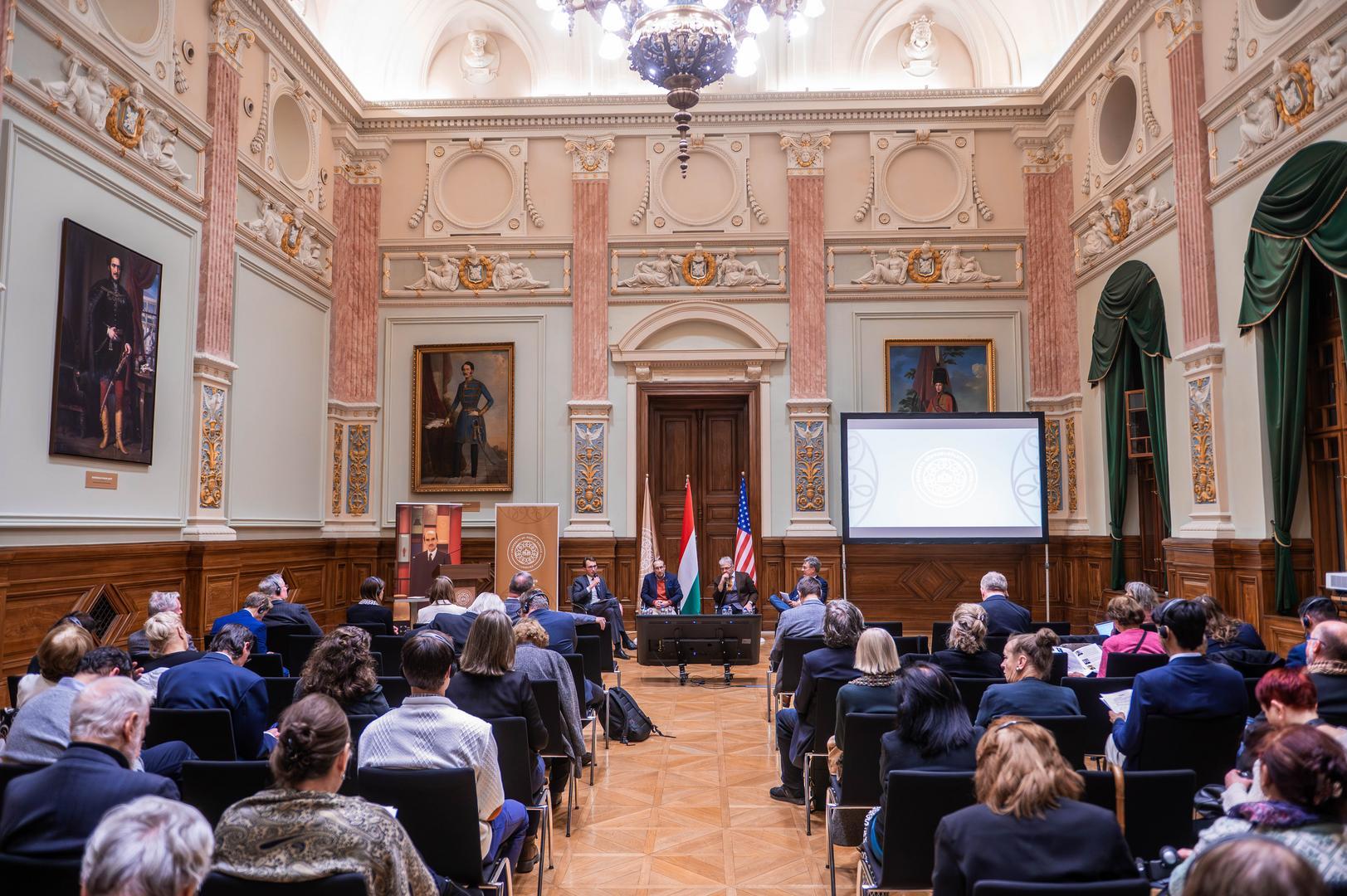 Gergely Prőhle, Program Director of the John Lukacs Institute and Director of the Otto von Habsburg Foundation, also welcomed the audience. He recalled that in 2013 he spent several days in Washington in the company of John Lukacs and his wife and highlighted the historian’s direct and approachable nature. He also spoke about the special moment when, in 2021, crates that had long been sealed in the university’s basement were finally opened, revealing John Lukacs’s personal belongings: the wine glass, the cigar box, and the small keepsakes all contributed to bringing visitors closer to the historian’s personality. These objects are not only mementos but also represent a task: the interpretation and transmission of the legacy. The director emphasized that, as the first pillar of the program series connected to the 250th anniversary, John Lukacs’s life’s work fittingly opens the dialogue examining the American contributions of thinkers of Hungarian origin.