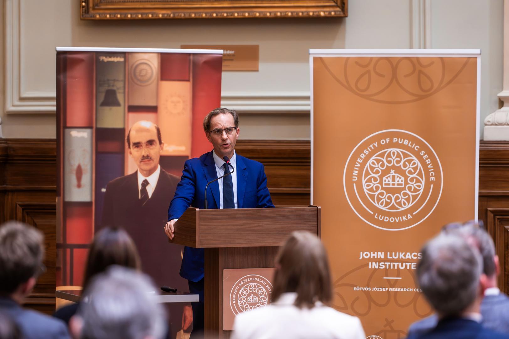 In his welcoming remarks, Gergely Deli, Rector of Ludovika University of Public Service, emphasized that the present conference created yet another opportunity to jointly review the intellectual legacy of the world-renowned historian, as well as the significance of his Hungarian and American identity. He stressed that Lukacs’s work and way of thinking are of particular importance for LUPS, which consciously cultivates John Lukacs’s intellectual heritage. Among other initiatives, in December 2021 the John Lukacs Lounge was opened in the university’s Side Building, where some of the historian’s personal belongings, books, and manuscripts are on display. This was followed in 2022 by a conference titled John Lukacs and American Conservatism, and in January 2024 his centenary was commemorated at a conference entitled Spirit and Character. In parallel, the John Lukacs Institute was established at the university, one of whose primary goals is the preservation and transmission of Lukacs’s intellectual legacy. Gergely Deli recalled that John Lukacs left Hungary with his family in 1944 at a young age, yet throughout his life he remained Hungarian in his identity. This is also expressed by the idea that became the motto of this year’s event. He emphasized that Lukacs’s approach to historiography introduced new emphases into 20th-century historiography: he placed the role of the individual, personality, and mentality at the center of historical analysis, creating a bridge between European and American modes of thought, and his historical writing remains a source of guidance today.